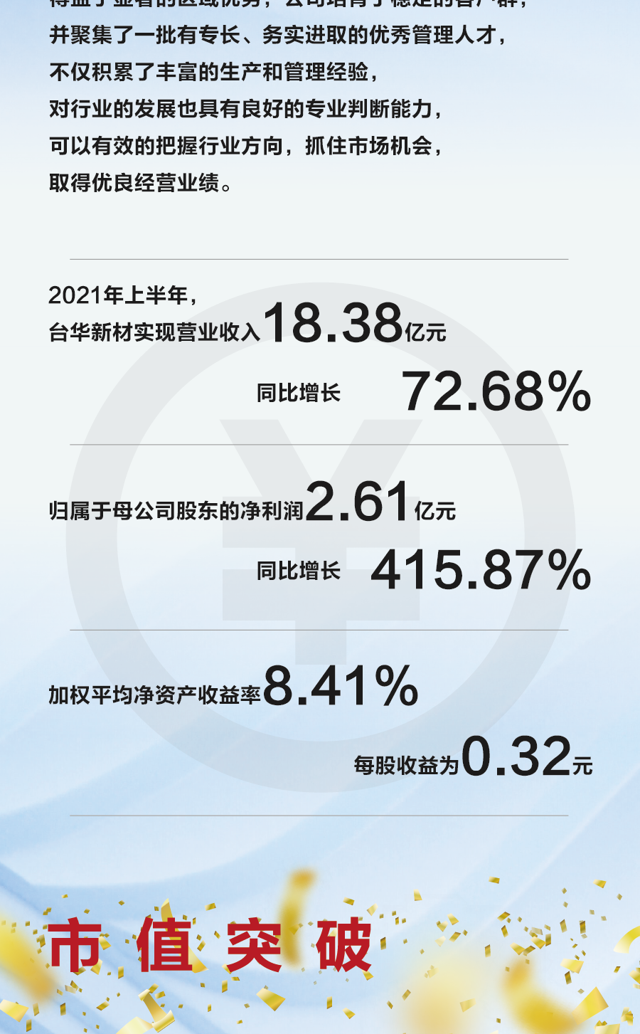 2021年上半年,臺(tái)華新材實(shí)現(xiàn)營業(yè)收入18.38億元,同比增長72.68%。歸屬于母公司股東的凈利潤2.61億元,同比增長415.87%,加權(quán)平均凈資產(chǎn)收益率8.41%,每股收益為0.32元。市值突破100億元!