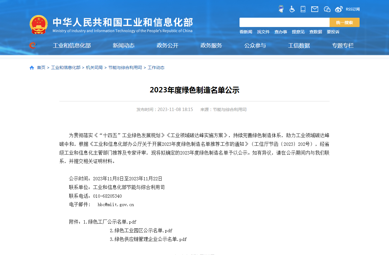 11月8日,工業和信息化部公示了2023年度綠色供應鏈管理企業名單,浙江臺華新材料股份有限公司位列榜中。