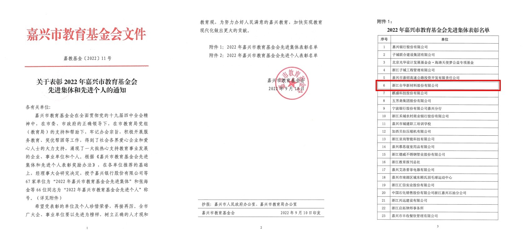 2016年、2021年臺華分別和嘉興市教育基金會簽訂捐贈協議100萬元,用于獎勵當地中小學德智體美勞全面發展的優秀學生